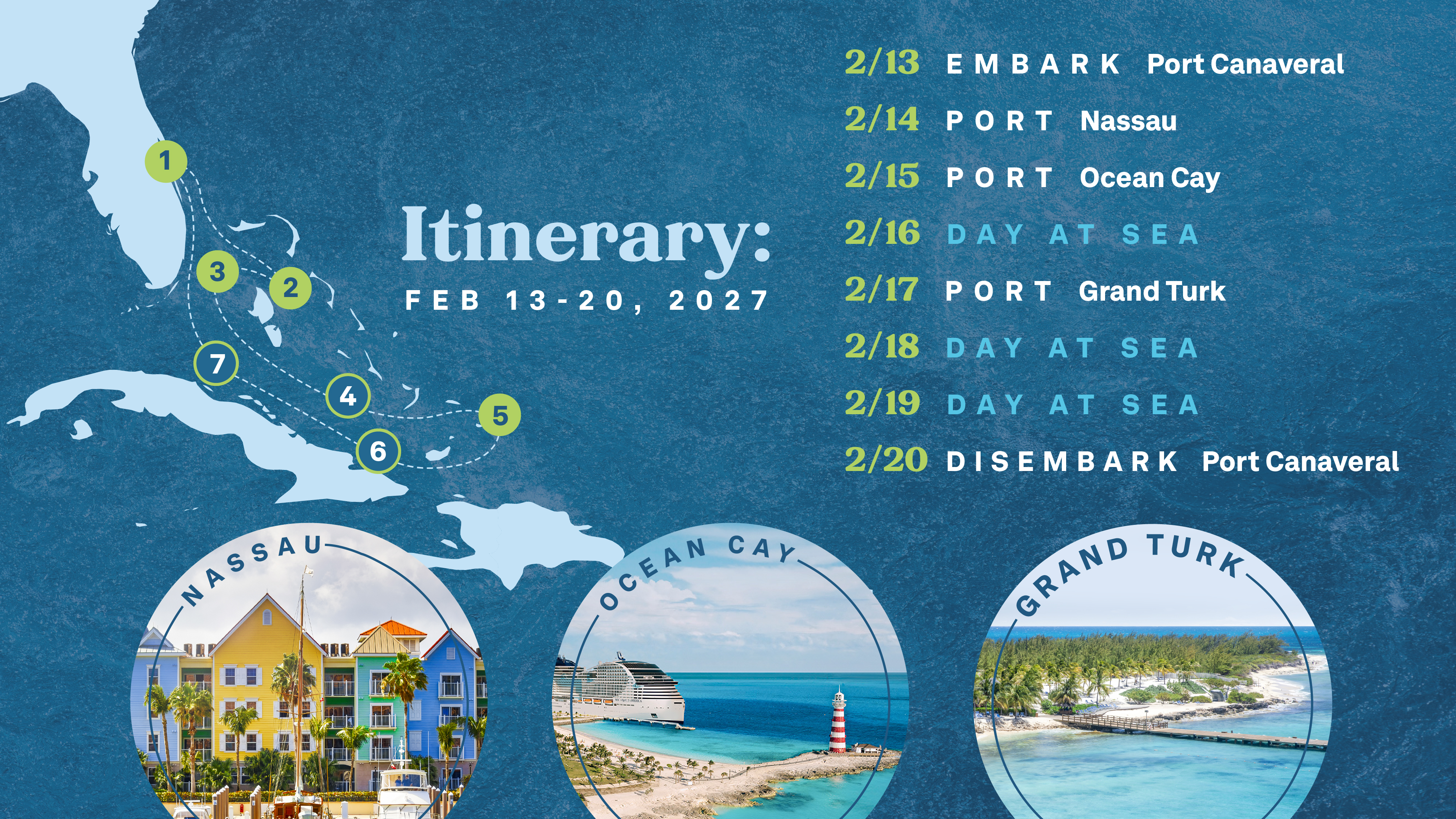 - We sail out of Port Canaveral in 2027 - fly in and out of Orlando. For a full itinerary, go HERE.